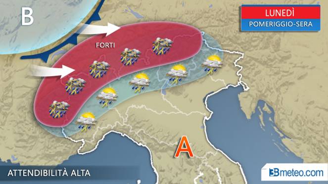 TRA DOMENICA E MARTEDI’ TEMPORALI ANCHE FORTI TRA ALPI E ALTE PIANURE DEL NORD – “L’estremo Nord Italia si prepara all’arrivo di una nuova perturbazione atlantica che in maniera repentina scalzerà via l’alta pressione a suon di temporali a iniziare dai rilievi alpini ma successivamente anche su diverse zone della Pianura Padana.” – lo conferma il meteorologo Francesco Del Francia di 3bmeteo.com che aggiunge – “saranno le zone alpine e prealpine a ricevere i temporali più intensi che assumeranno anche carattere di nubifragio con associate grandinate e raffiche di vento anche superiori ai 70-90km/h. Dalla sera di domenica le aree coinvolte dai primi nuclei temporaleschi saranno le aree alpine di Valle d’Aosta e Piemonte nord-occidentale con possibili sconfinamenti su alte pianure di Torinese, Biellese, Novarese, Verbano, così come le aree pedemontane della Lombardia occidentale e la Valtellina. Un secondo e più forte impulso transiterà, nel corso di lunedì sul Nord-Ovest, nuovamente con temporali anche di forte intensità tra Valle d’Aosta, Piemonte centro-settentrionale e Lombardia occidentale, soprattutto su alta Valtellina, Valchiavenna e alta Valcamonica; in maniera più attenuata sulle Alpi Orobiche e localmente sulle alte pianure lombarde. Sarà proprio il pomeriggio-sera di lunedì il momento in cui si potranno verificare le maggiori criticità idrogeologiche, specie in area prealpina dove non si escludono anche temporali autorigeneranti con ingenti quantitativi pluviometrici. Entro la prima nottata di lunedì i temporali interesseranno anche il Trentino settentrionale e il bellunese, mentre martedì ritroveremo temporali localmente forti, dalla seconda parte della giornata, su buona parte del Triveneto e in tarda sera anche sulle basse pianure di Lombardia e dell’Emilia Romagna.”