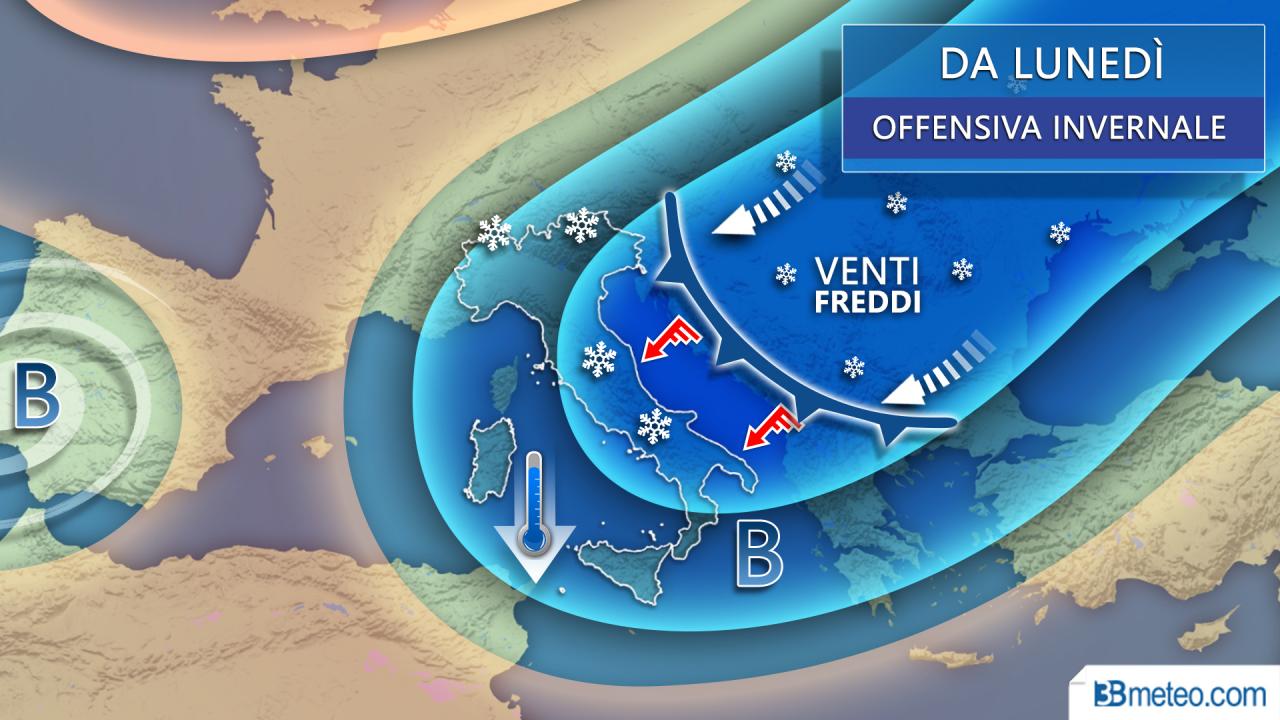 Andrea Vuolo di 3bmeteo.com :“da lunedì gelidi venti dalla Russia causeranno un tracollo termico anche di 10-15°C con rovesci di neve a quote molto basse, a tratti fino in pianura sul versante adriatico. Venti forti di grecale, bora e tramontana con raffiche di oltre 70 km/h”