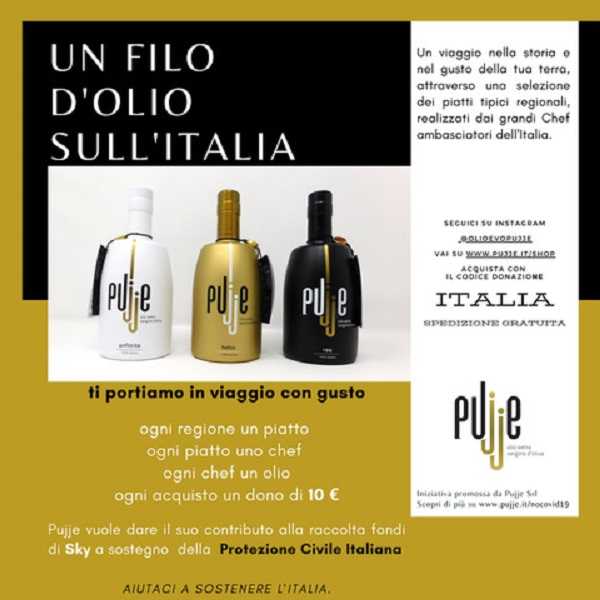 Sì, l’Italia che, mai come oggi, è sofferente, ma molto combattiva. Pujje ha pensato quindi di devolvere 10 € per ogni acquisto sul suo shop on line alla Protezione Civile Italiana. La raccolta fondi è promossa sul profilo Instagram di Olio Evo Pujje, da cui è possibile accedere alle ricette stellate e al sito per effettuare gli acquisti con codice di donazione ITALIA.