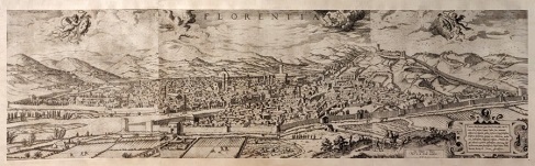 Eseguita ad Anversa nella stamperia di Hieronymus Cock, incisore ed editore che nel XVI secolo svolse un ruolo di grande rilievo nel panorama europeo della produzione e diffusione di immagini e cartografia a stampa, l’opera è composta da tre grandi fogli assemblati. Presenta lungo il bordo superiore il titolo “FLORENTIA” tra due putti che sostengono rispettivamente lo stemma mediceo a sinistra e il giglio fiorentino a destra. Nell’angolo inferiore destro una lunga iscrizione decanta le qualità di Firenze e dei suoi cittadini illustri, a partire dalla casata dei Medici e ricordando poi Dante, Poliziano, Petrarca, Boccaccio, Michelangelo. La veduta fu incisa nel 1557 dai fratelli Lucas e Jan Van Doetecum, abituali collaboratori di Cock, sotto l’attenta supervisione di quest’ultimo. Di questa stampa ottenuta dalla matrice originale esiste solo un altro esemplare al mondo: appartenuto in passato a Leo Olschki ed esposto in una mostra alla Galleria dell’Accademia nel 1935, oggi si conserva a Stoccolma alla Kungliga Biblioteket, la biblioteca nazionale di Svezia.