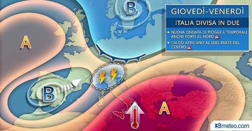 WEEKEND DAI DUE VOLTI METEO, ALTRI ACQUAZZONI AL NORD, ANCORA CALDO AFRICANO AL SUD – “Anche il fine settimana vedrà una Italia divisa meteorologicamente in due: al Nord sono attesi ulteriori rovesci e temporali sparsi, specie sabato, anche se non dovrebbero risultare violenti come quelli della notte scorsa. Occasionali fenomeni potranno interessare anche il Centro dove tuttavia prevarranno condizioni più soleggiate. Al Sud continuerà a fare caldo, con una nuova ondata africana specie tra Sicilia, Calabria, Basilicata e Salento.” – concludono da 3bmeteo.com