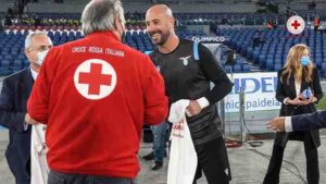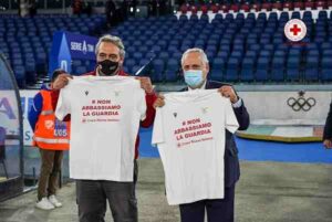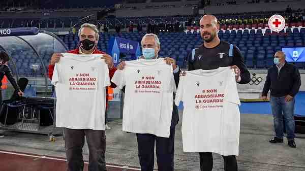 #NonAbbassiamoLaGuardia, il messaggio sulla maglia indossata dal Presidente CRI Francesco Rocca, dal Presidente della squadra biancoceleste Claudio Lotito e dal portiere Pepe Reina prima del fischio d’inizio della partita Lazio-Atalanta.