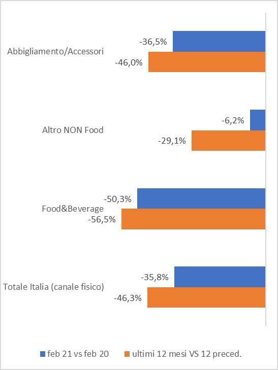 L’Osservatorio permanente sull’andamento dei consumi nei settori ristorazione, abbigliamento e non food elaborato da Confimprese-EY registra ancora un forte calo dei consumi a febbraio vs febbraio 2020 con -35,8%. Il crollo più importante arriva dalla ristorazione -50,3%, l’abbigliamento chiude a -36,5%, il non food riduce le perdite col -6,2%. I centri commerciali mostrano un calo pari a -43,2%.