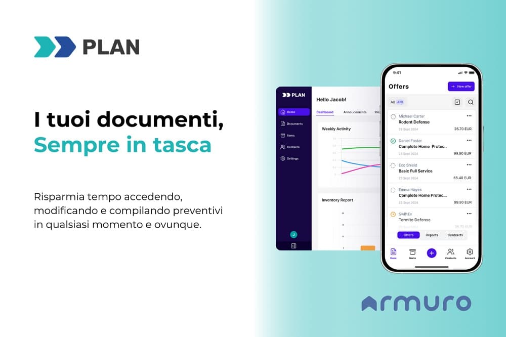 Gestire un’azienda di disinfestazione non deve essere complicato. Con PLAN di Armuro, puoi dire addio a scartoffie, agende disorganizzate e magazzini caotici, aprendo la strada a un modello di lavoro più efficiente, organizzato e professionale. PLAN diventa così un alleato affidabile che trasforma la gestione quotidiana in un processo fluido e senza stress. Grazie a questo software per disinfestazione, il futuro della tua impresa è già a portata di mano.