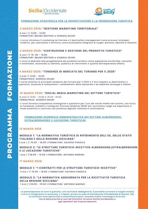 Il corso è gratuito e si terrà presso la sede di Sicindustria, in Via Mafalda di Savoia 26, Trapani, dal 3 al 17 marzo 2026. Per ulteriori informazioni è possibile contattare il Distretto Turistico Sicilia Occidentale (www.westofsicily.it).