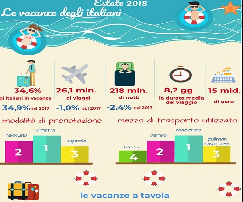• In leggero calo, dopo tre anni di crescita, il numero degli italiani che farà vacanza in estate: erano oltre 21 milioni nel 2017, quest’anno saranno 200 mila in meno. In lieve calo la durata media dei soggiorni (8,2 giorni rispetto agli 8,4 del 2017); Saranno 26,1 milioni i viaggi per vacanza, con un calo dell’1% rispetto al 2017 (quando erano stati 27,8 milioni), per una spesa totale di 15 miliardi di euro; In lieve calo anche le presenze: saranno circa 218 milioni rispetto ai quasi 223 milioni del 2017;