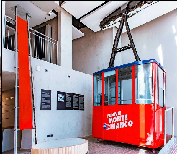 Al piano inferiore si spalanca un’emozionante finestra sul passato e sulla primissima funivia inaugurata nel 1947, che ha continuato incessantemente a compiere i suoi percorsi sul Monte Bianco fino al 2015. L’opera artistica di Letizia Cariello, Una scala appesa al cielo è realizzata con pioli della fune traente della funivia: una scala di acciaio lucidato a specchio che, in luogo dei pioli, ha la fune che un tempo conduceva le cabinovie della funivia e che così rinnova il proprio ideale compito di condurre in alto i piedi di ideali osservatori. Verso l’uscita dell’Hangar, un’ultima sorpresa attende il visitatore: un foulard di seta che, come un quadro, rappresenta idealmente l’evoluzione delle magiche cabine appese a un filo, grazie alla creatività dell’artista valdostano Chicco Margaroli.