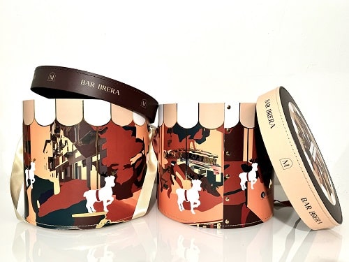 La confezione è un’opera d’arte: una raffinata cappelliera ideata da Silvia Rosa, giovane artista dell’Accademia di Belle Arti di Brera. La grafica rappresenta un carillon con l’iconico angolo di Bar Brera, fondendo arte e tradizione in un design unico.