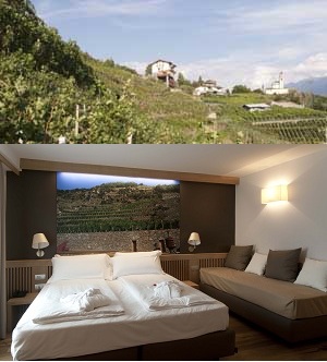 Sulla porta di ogni camera è serigrafata la bottiglia di un grande vino valtellinese. All’interno l’arredamento segue uno stile e un’atmosfera dove sono ancora la tradizione e il vino a predominare, grazie all’uso di pietre e legni locali e alla grande immagine sulla parete raffigurante proprio il vigneto da cui nasce il vino che dà il nome alla camera.