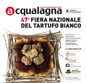 ACQUALAGNA: Acqualagna è una cittadina di 4.400 abitanti situata nell’entroterra della provincia di Pesaro e Urbino, nelle Marche. E’ definita a livello nazionale, la Capitale del Tartufo, vista la sua importanza riconosciuta durante tutto l’anno per i vari eventi dedicati e per la tradizione plurisecolare di ricerca, produzione e commercializzazione del tubero più famoso di tutti i tempi. La città si trova nei pressi della magnifica Gola del Furlo, nella confluenza del torrente Burano, una terra circondata da natura incontaminata e da uno scenario incantevole per gli occhi del visitatore che viene a scoprirla. La posizione di Acqualagna è strategica perchè offre ai suoi ospiti la vicinanza ai monti più alti della zona: il Catria ed il Nerone. Per questa sua caratteristica, permette di intraprendere percorsi a piedi, in bici ed anche a cavallo sia in inverno che in estate. Itinerari naturalistici molto belli, che ti porteranno alla scoperta del territorio più inesplorato. Nelle Marche la secolare tradizione di ricerca, produzione e vendita del tartufo fa sì che il suo mercato sia il luogo di incontro privilegiato per la promozione e la commercializzazione sia a livello nazionale sia internazionale. Acqualagna è sede di raccolta dei 2/3 dell’intera produzione nazionale del prezioso tubero, con circa 600 quintali di tartufo di tutti i tipi. L’intera cittadina di Acqualagna mette i propri spazi a disposizione dell’evento. La piazza principale ospita gli stand dei commercianti di tartufo fresco, anima storica della festa. Il Palatartufo è il più importante spazio di accoglienza per gli oltre 200.000 visitatori della Fiera. Passeggiando per i suoi 4.000 mq, gli appassionati di cultura enogastronomica possono assaggiare e acquistare ciò che di meglio offre la cucina tradizionale italiana: le produzioni legate al tartufo tipiche del territorio, i molteplici prodotti ed esempi prelibati di produzione gastronomica delle altre regioni italiane. Inoltre si può visitare l’area dedicata all’artigianato locale del mobile e della celebre lavorazione artistica della pietra.