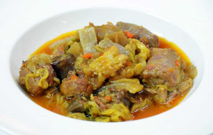 Ingredienti: 600 grammi di lonza di maiale, 350 grammi di tempia di maiale, 100 grammi di ceci, due cipolline affettate, rosmarino, carota, sedano, parmigiano grattugiato, sale, pepe, un pizzico di bicarbonato. Il giorno prima mettere i ceci in un recipiente con molta acqua fredda e un pizzico di bicarbonato. Indi in una pentola con acqua non salata far cuocere per circa 4 ore i ceci a fuoco lento, senza mai scoperchiare. A parte lessare la carne di maiale con il sedano a piccoli tronchetti, la carota tagliata a rondelle fini, il rosmarino, sale e pepe. Mezzoraprima della completa cottura riunire in un unico recipiente le due preparazioni per far prendere loro sapore. Portare in tavola la minestra, cospargendola di parmigiano grattugiato